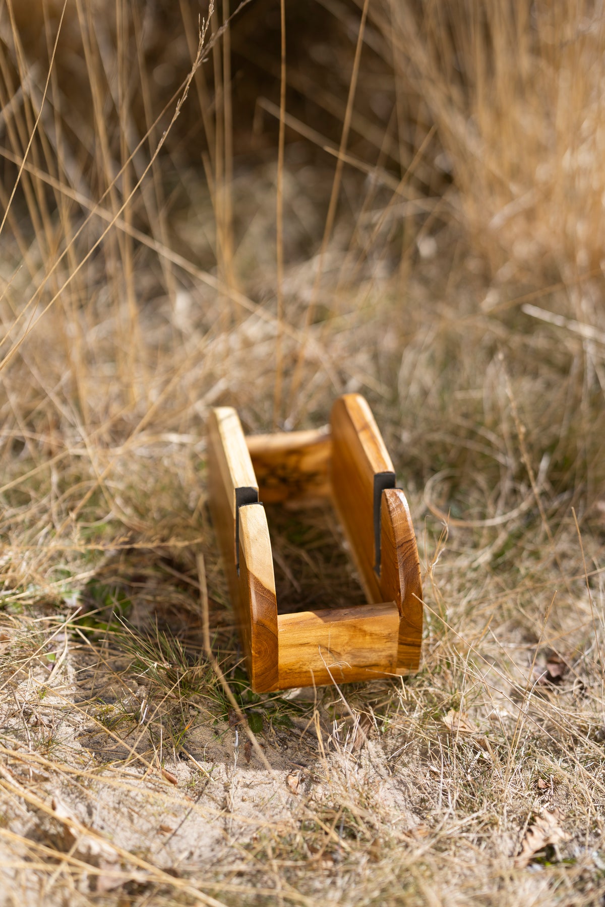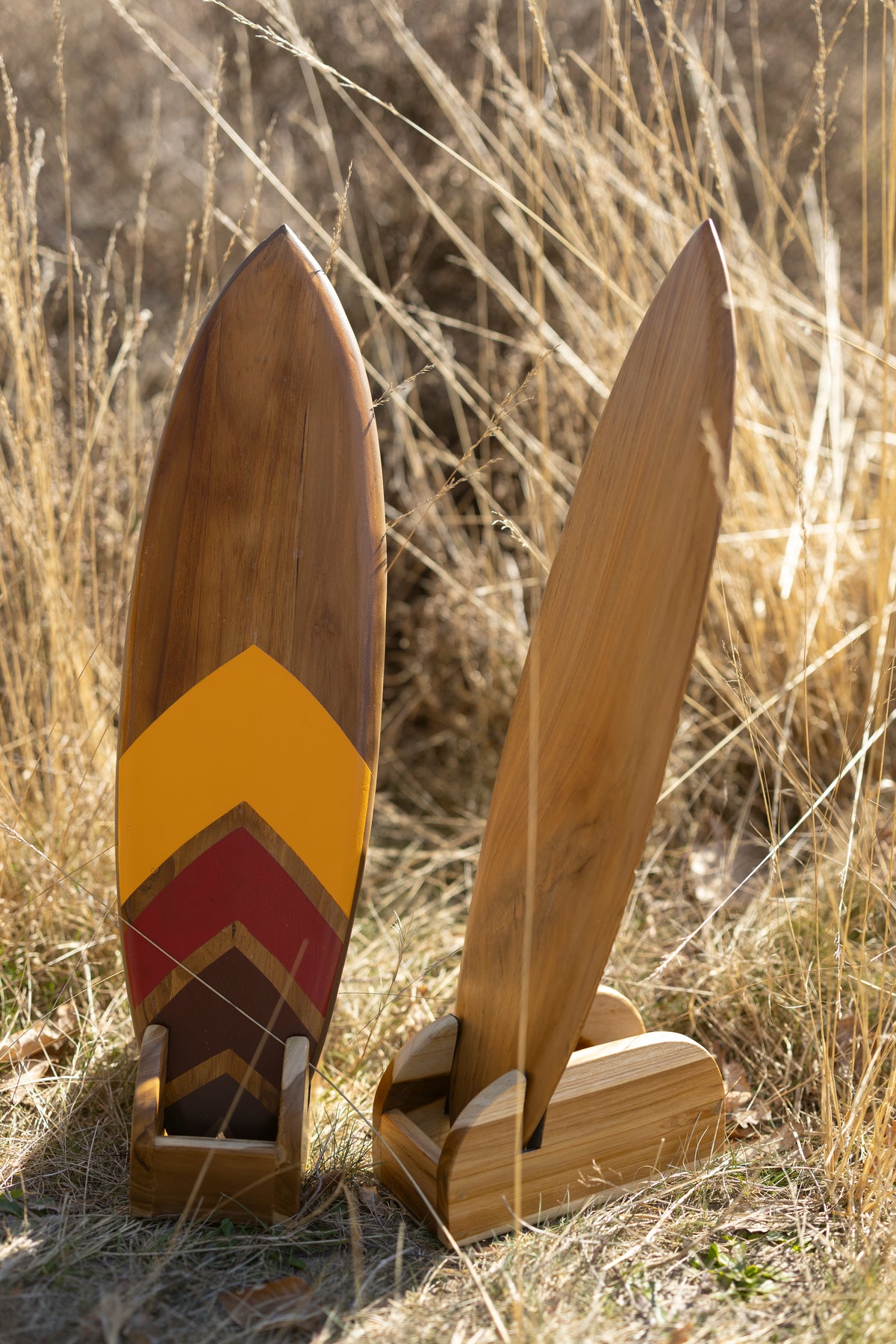 El soporte está hecho a mano con madera de teca y combina perfectamente con el carácter natural de las tablas Tidez. El corte está precisamente ajustado a la forma y grosor de nuestras tablas de surf de 60cm, asegurando que la tabla se mantenga firme sin volcarse ni deslizarse.